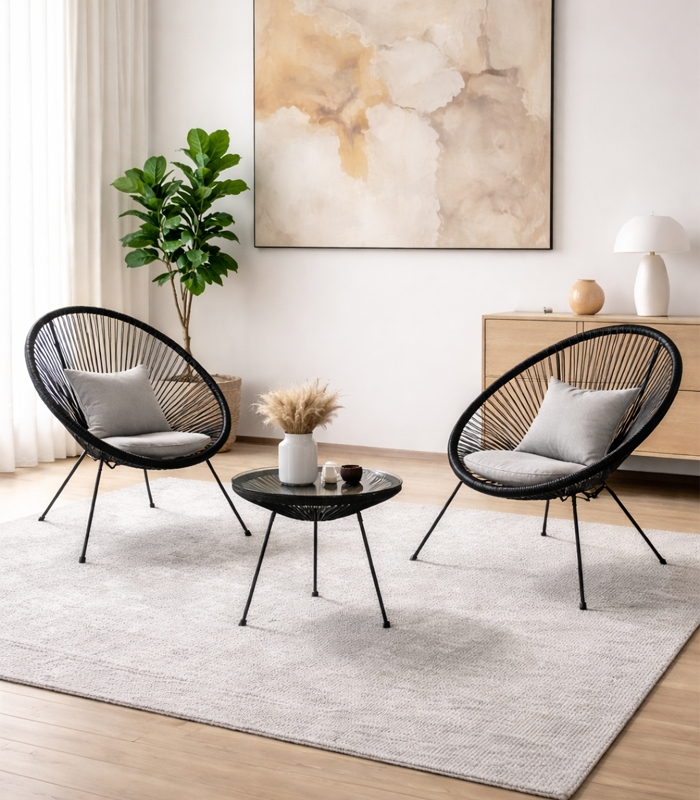 Siedziska foteli zostały zaprojektowane tak, aby zapewnić wygodę i odpowiednie podparcie dla ciała. Dzięki temu zestaw doskonale sprawdzi się podczas dłuższego wypoczynku, spotkań z bliskimi czy chwil relaksu z ulubioną książką. Praktyczny stolik uzupełnia całość, oferując wygodne miejsce na napoje i drobne przedmioty.
