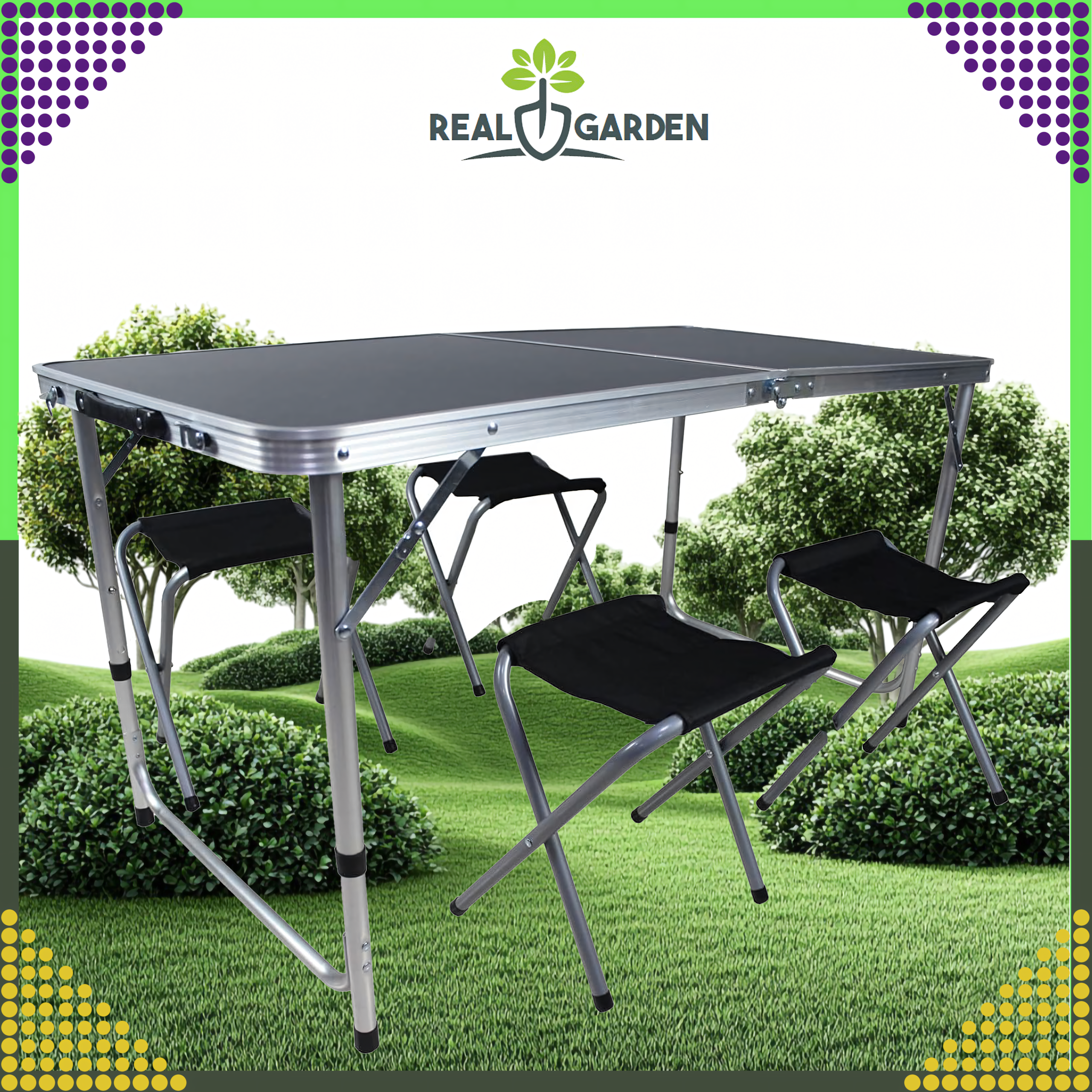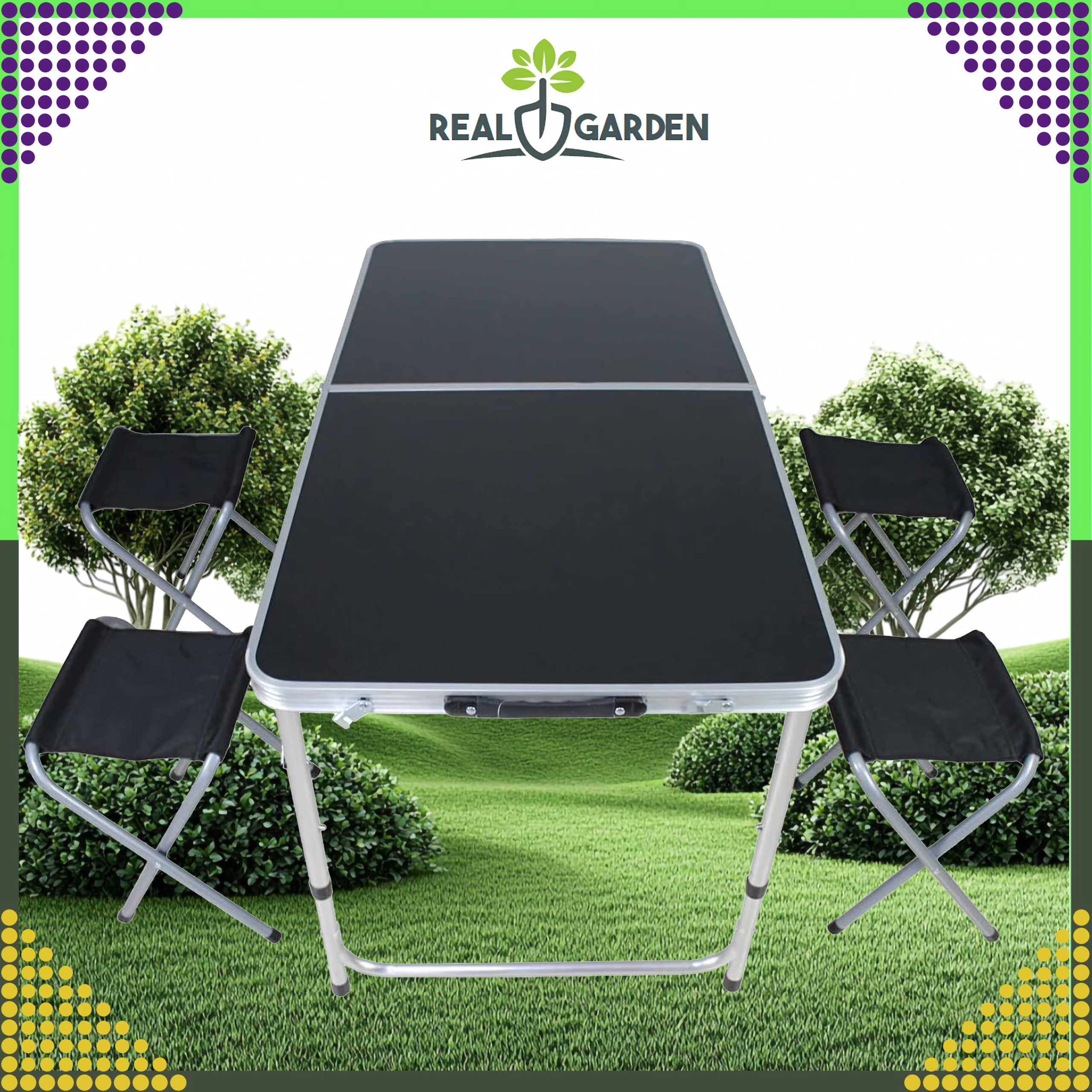 Zestaw składa się z jednego dużego składanego stolika i czterech składanych krzeseł. Całość można złożyć do formy kompaktowej walizki z uchwytem, co ułatwia transport i przechowywanie.